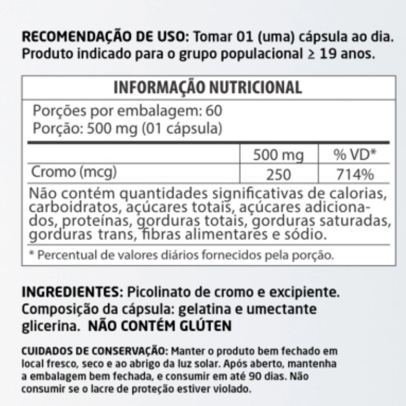 Em até 6x de R$833.17 sem juros À vistaR$4,499.10no Pix Picolinato de Cromo 60 cápsulas 500mg Herbalize